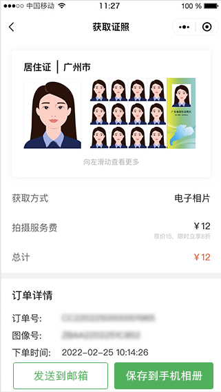 获取电子证照,提供发送到邮箱和保存到手机相册功能