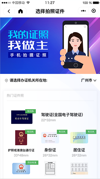 目前开通了驾驶证、出入境证件、身份证、居住证、社保卡等法定证件相片、标准寸照和工作学习类证件